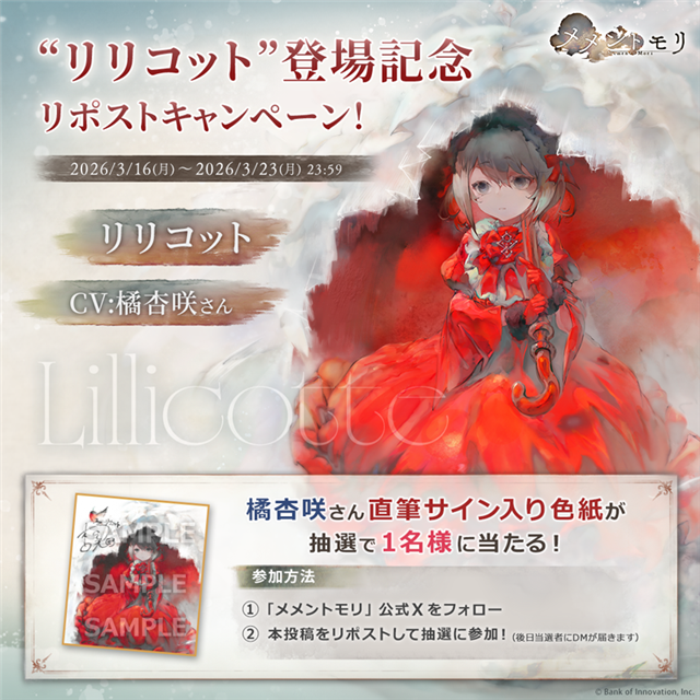 【応募方法】メメントモリ公式 X アカウント(@mementomori_boi)をフォローし、対象の公式ポストをリポストすると、抽選で1名にリリコット役橘杏咲さんの直筆サイン入り色紙が当たる。