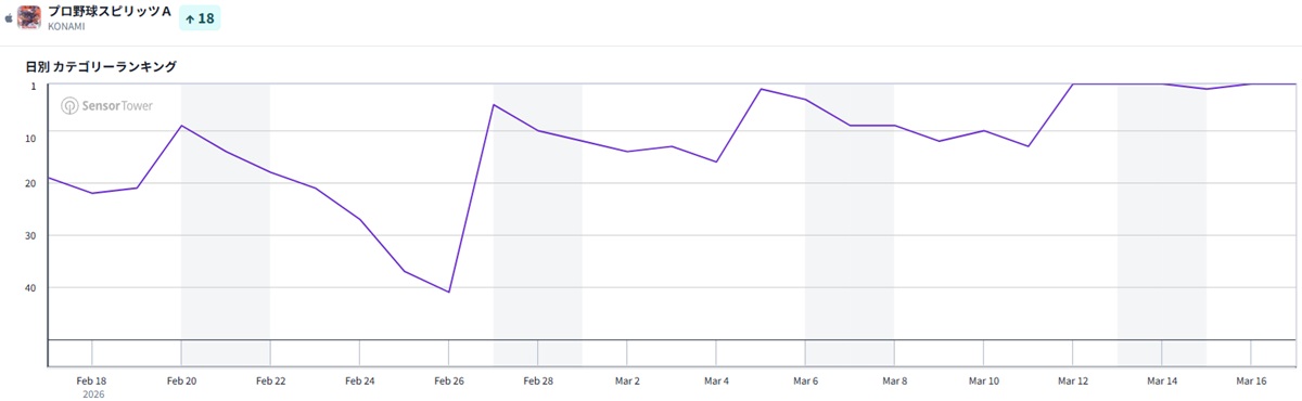 3月17日9時半現在のApp Storeセールスランキング(ゲームカテゴリー)は、前日2位のコナミデジタルエンタテインメント『プロ野球スピリッツA』が、『モンスターストライク』をかわして首位に立った。