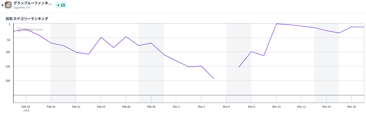 『グラブル』は3月16日19時よりグランデフェスを開催。「オクタヴィア」(リミテッドシリーズ)と「アポロニア」(水着ver.)、「ユーステス」(浴衣ver.)の解放武器が登場しており、売り上げを伸ばしたようだ。