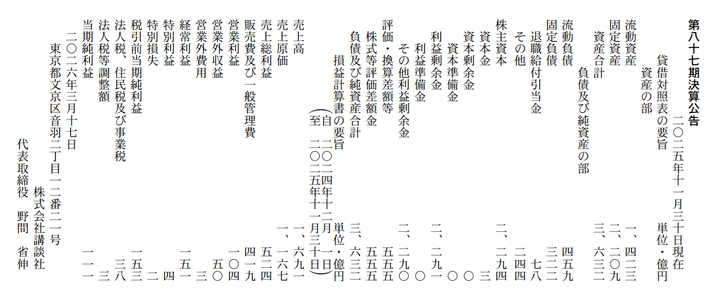 講談社の2025年11月期(第87期)の決算は、売上高1691億円(前の期比1.1%減)、営業利益104億円(同3.8%減)、経常利益151億円(同5.6%増)、最終利益111億円(同19.4%増)だった。3月17日付の『官報』に掲載された「決算公告」が掲載された。