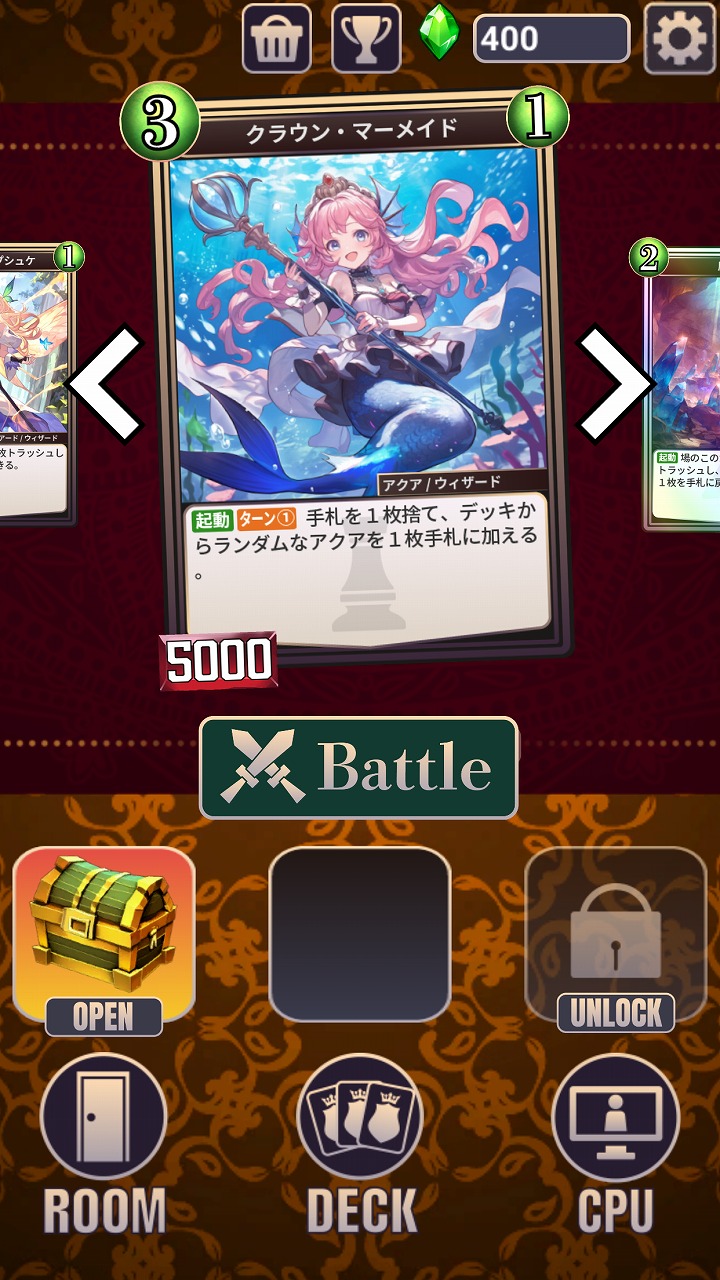 勝っても負けてもプレイを重ねるほどカードが手に入り、無課金でもカードを集めてデッキを強化できる。