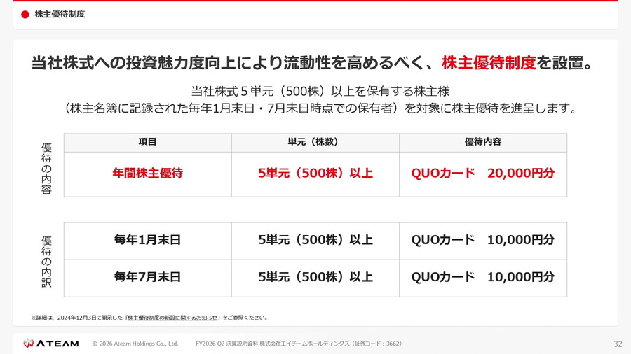 また株主優待として、500株以上保有する株主に対し年2回、各1万円分(年間2万円分)のQUOカードを進呈している。