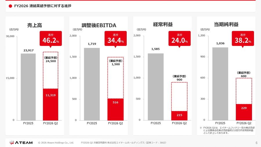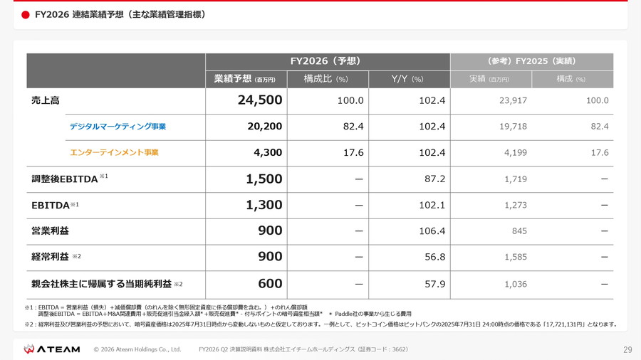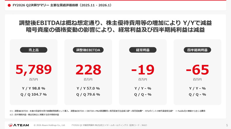 エイチームホールディングス<3662>は、2026年度第2四半期の決算説明会の動画を公開した。暗号資産の価格下落による評価損の影響などにより、経常損失および最終損失を計上したことを明らかにした。一方で主力のデジタルマーケティング事業は堅調に推移しており、通期業績予想は据え置いている。エンターテインメント事業も安定した黒字を維持しながら次の柱を育てるフェーズに入っていることが伺える。