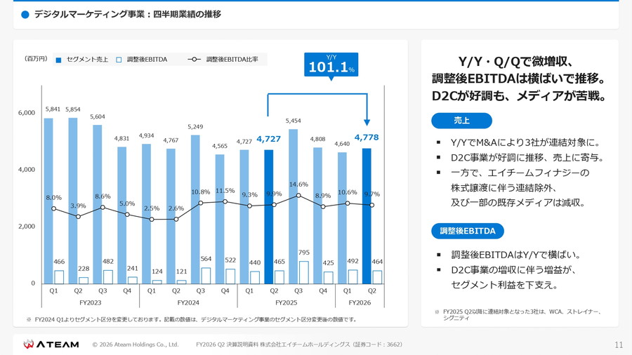 一部メディア事業では苦戦があったものの、D2C事業の成長が利益を下支えした。また当四半期から、M&Aで取得したWCS、トレーナー、SIGNITYの3社が連結対象に加わっている。
