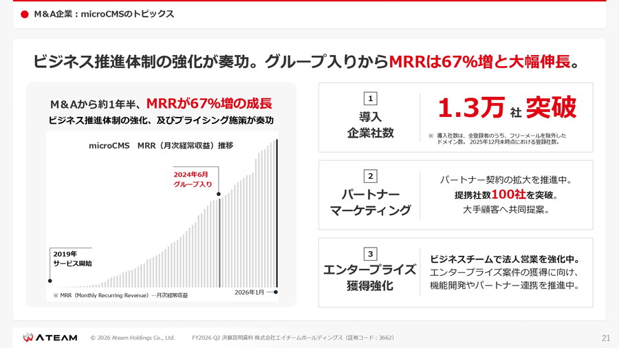 ヘッドレスCMSを提供するmicroCMSは、グループ入り後にMRR(月次経常収益)が67%増加。導入社数は1万3000社を突破し、パートナー代理店も100社以上に拡大した。