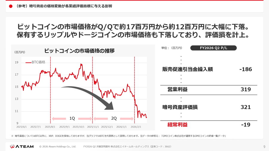 同社によると、暗号資産価格が下落した場合、販売促進引当金が減少することで営業利益は増加する一方、保有資産の評価額が下がることで営業外費用として評価損が発生する構造となっている。