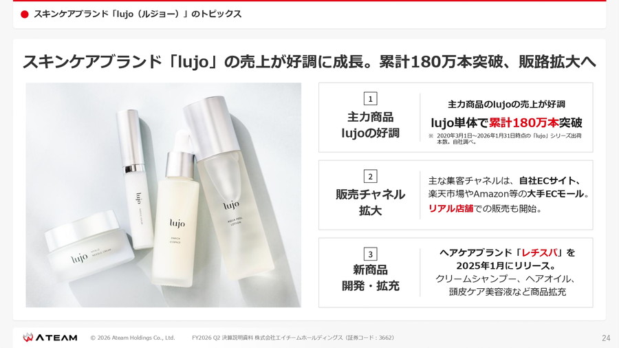 スキンケアブランド「lujo」は累計販売数180万本を突破し、ECに加えてドラッグストアなど実店舗での販売も開始。ヘアケアブランド「HSPa」やドッグフードブランド「Obremo」も展開を拡大している。