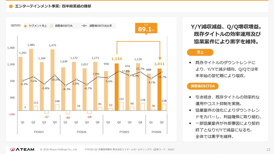 一方で、同事業は7四半期連続で営業黒字を達成しており、収益体質の改善が着実に進んでいる点は評価できる。年末年始の繁忙期効果に加え、既存タイトルの効率的な運用や協業案件の積み上げが、安定した利益創出につながっている。