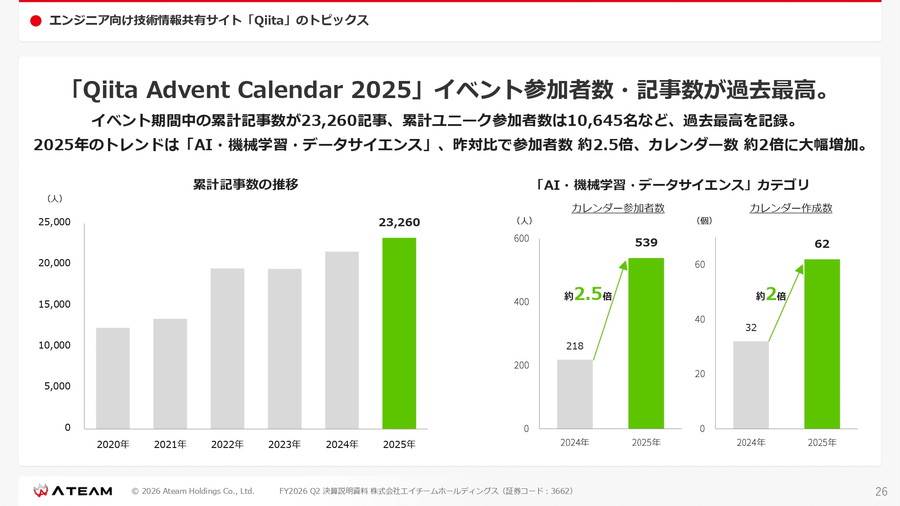 また、同社が運営するエンジニア向け情報共有サイトQiitaは会員数が120万人を突破。毎年開催している「アドベントカレンダー」イベントでは投稿数が過去最多の2万3260記事となり、参加者数は前年比約2.5倍に増加した。