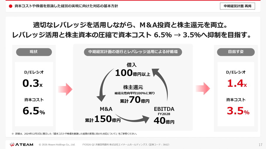 同社は現在、DEレシオ0.3倍、資本コスト6.5%の状態から、借入を活用してM&A投資を拡大し、EBITDAと企業価値の向上を図る方針を掲げている。中期的には、借入金100億円規模、総資産170億円規模のバランスシートを目指す。