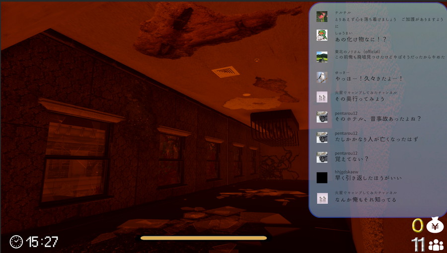 主人公は廃ホテルで手に入れた不思議なカメラを駆使し、出現する怪物を倒していく。また、動画配信者としても活動しており、探索中に視聴者からのコメントやスパチャを受け取る。プレイヤーはコメントをもとに謎を解き明かし、スパチャを使ってゲームを進めるためのアイテムを購入できる。なぜ怪物が出現するのか、不思議なカメラが生まれた謎を追う。