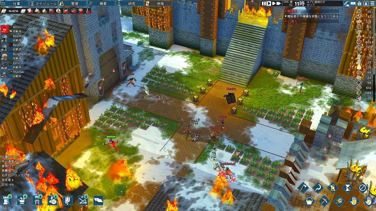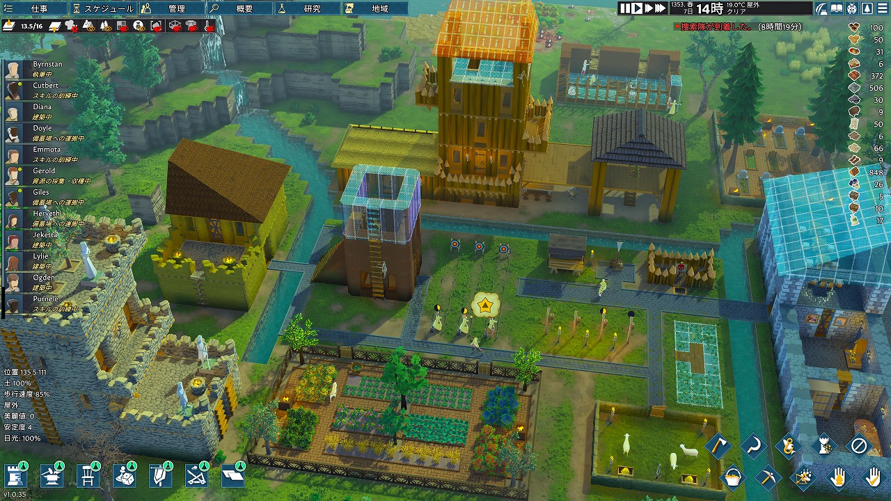 なお、要塞には絶え間なく略奪者たちが襲いかかる。中世の技術を研究・クラフトしたり、入植者を武装させたり、罠を築いたりして、この地を守り、成長しよう。