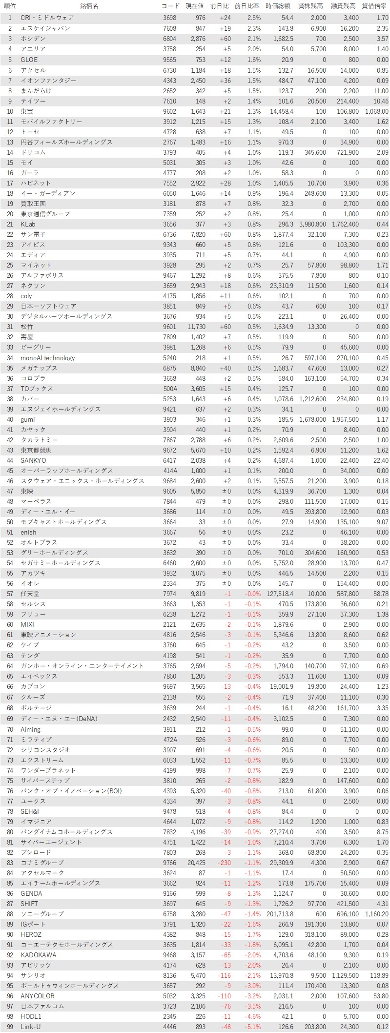 最後に騰落ランキングを見ると、CRI・ミドルウェア<3698>やエスケイジャパン<7608>、ホシデン<6804>、アエリア<3758>、GLOE<9565>が値上がり率上位となり、下方修正のLink-U<4446>が引き続き売られて値下がり率1位となったほか、HODL1<2345>、日本ファルコム<3723>、ANYCOLOR<5032>、ポールトゥウィンHD<3657>が値下がり率上位となった。