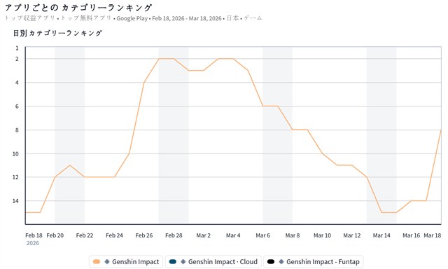 トップ10圏内では、HoYoverseの『原神』が前日の14位から7位に順位を上げてきた。『原神』は、3月17日19時より、限定★5キャラクター「虚淵の暗星・スカーク(氷)」の出現確率が大幅にUPしたイベント祈願「虚星の来臨」を実施していることなどが売上に大きく寄与しているようだ。