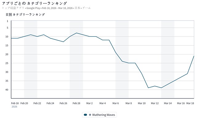 また、KURO GAMESの『鳴潮(メイチョウ)』が前日の31位から19位とトップ20圏内まで浮上してきた。『鳴潮』は、本日3月19日に大型アップデートVer.3.2「闇を照らす光の意志」を配信開始予定であり、前半限定ガチャに新限定星5共鳴者「シグリカ」が登場予定であることから、ここからさらに上位をうかがう展開となってくることが予想される。