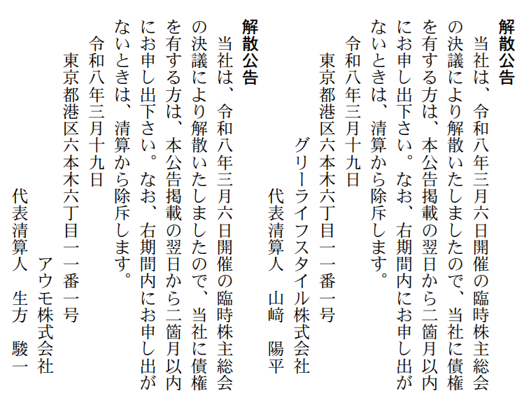 グリーライフスタイルとアウモが解散したことがわかった。3月19日付の「官報」に掲載された「解散公告」がよると、両社は3月6日に解散したとのこと。