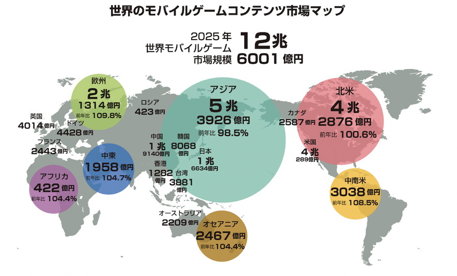角川アスキー総合研究所は、2026年3月19日、モバイルゲーム業界のデータ年鑑『ファミ通モバイルゲーム白書2026』を発売し、2025年の世界モバイルゲームのコンテンツ市場規模は、前年比1.4%増の12兆6001億円との推計を発表した。モバイルゲーム市場は2015年の調査開始以来拡大路線を辿っていたが、コロナ禍における巣ごもり需要の反動により2022年から2023年にかけて一度減少した。しかし、2024年から2年連続で再び成長傾向にあるという。