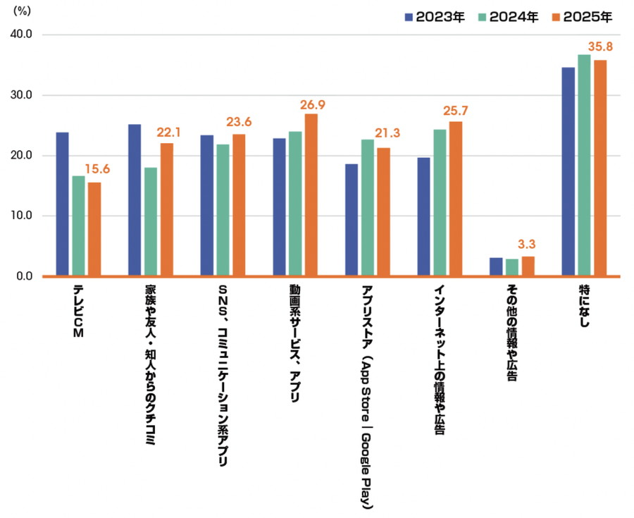 この傾向は、2023年までトップであった「家族や友人・知人からのクチコミ」に代わり、「動画系サービス、アプリ」が2024年から首位となって以降、継続している。一方で、「テレビCM」の影響力はやや後退しており、テレビ離れの現象が反映されていると推察される。