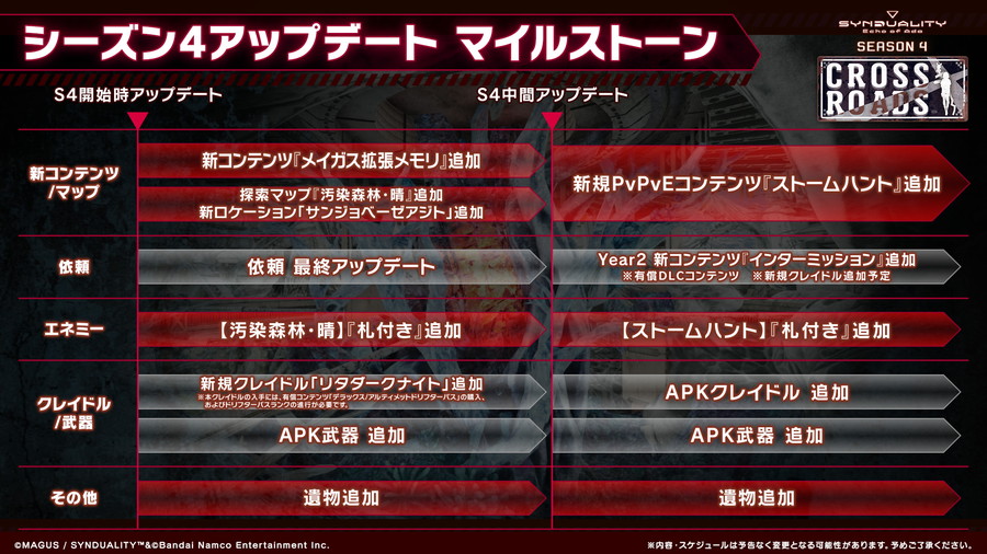 SEASON4「CROSS ROADS」では、新たな探索マップ「汚染森林・晴」および新規ロケーション「サンジョベーゼアジト」を追加したほか、メイガスの新たな強化要素「メイガス拡張メモリ」が登場。物語がひとつの区切りを迎え、本作が新たな局面へ進む節目のシーズンとして、今後の展開につながる各種機能・コンテンツを実装している。