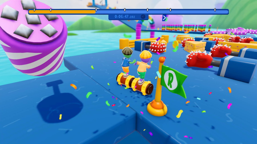 ・分割コントロールのカオス: 一方のプレイヤーがシリンダーの左側を、もう一方が右側を操作する。同期した動きでスピードアップするか、バラバラに動いて転落するかの二択だ。