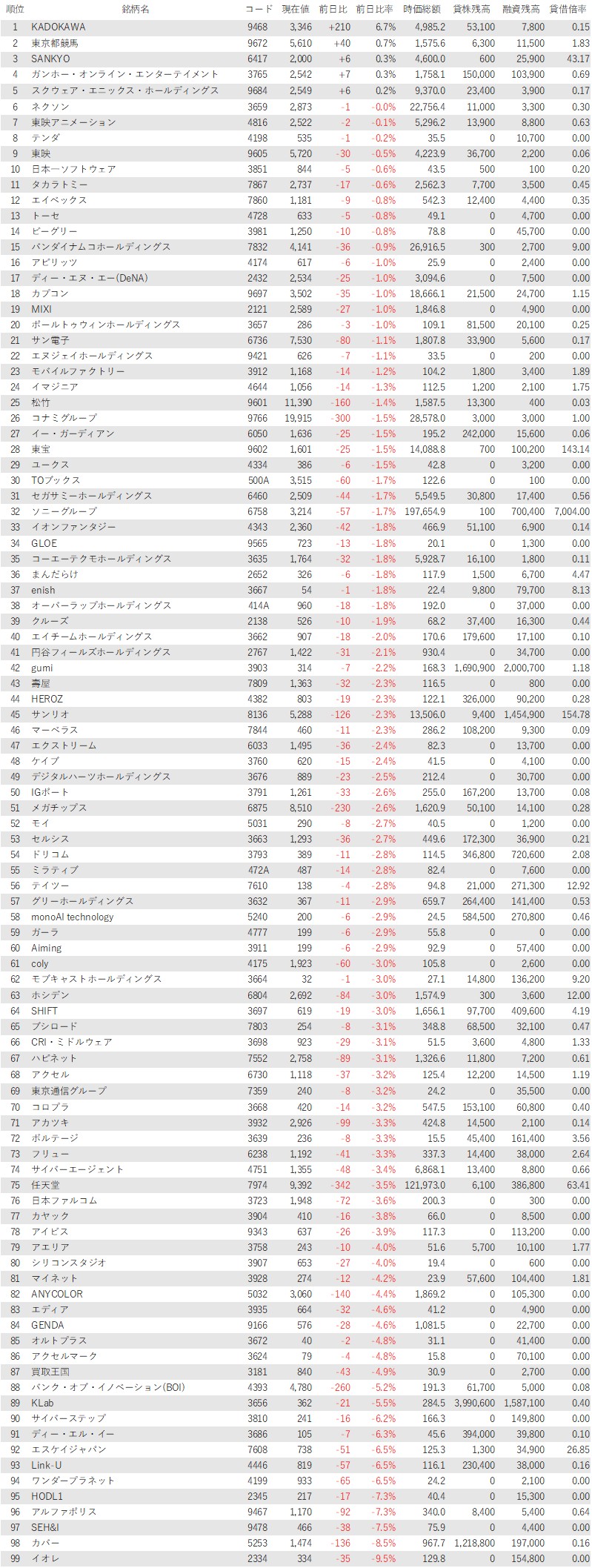 こうしたなか、ゲーム・エンタメ関連企業をみると、登録されている99銘柄のうち、上昇は5銘柄(5%)、下落は94銘柄(95%)、変わらずは0銘柄(0%)でほぼ全面安商状だった。