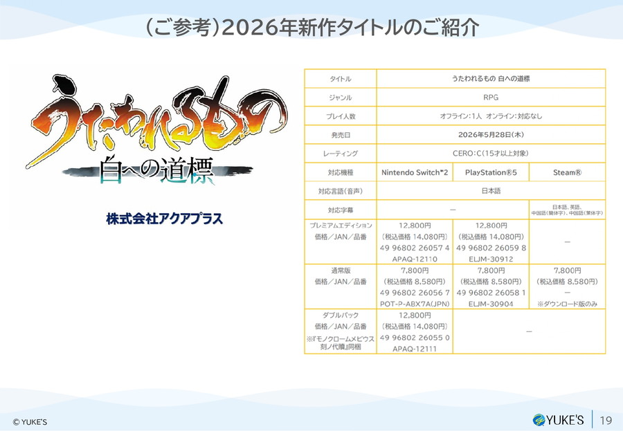 アクアプラスの既存IP活用や新規タイトル「うたわれるもの 白への道標」の開発に加え、ユークス本体でも社内公募制度などを活用したIP創出を推進。IPの創出から展開までをグループ一体で担う体制を整えていく。
