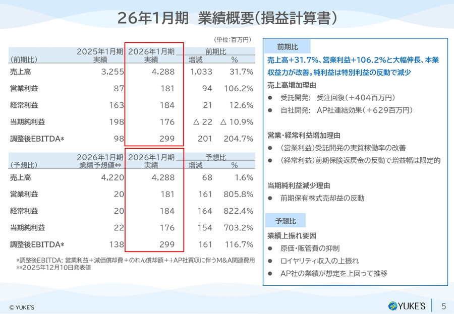2026年1月期の連結業績は、売上高が前の期比31.7%増の42億8800万円、営業利益は同106.2%増の1億8100万円と大幅な増収増益となった。経常利益は1億8400万円(同12.6%増)、一方で当期純利益は1億7600万円(同10.9%減)と減益となったが、これは主にのれん償却などの影響によるものとみられる。