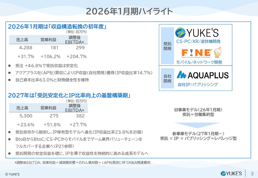 ユークス<4334>は、2026年1月期の決算資料を公開し、受託開発の回復とIPビジネスの立ち上がりを背景に増収増益を達成したことを明らかにした。「収益構造転換の初年度」と位置付けた同年度は、従来の受託依存から、自社IPを組み合わせたハイブリッド型モデルへの転換が進んだ一年となった。