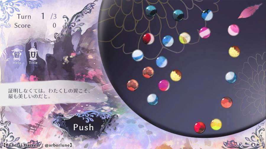 極楽浄土に住む美しき半身鳥女のカラヴィンカと、白い蓮花の仙女の流転を描く本ゲームは、色とりどりのおはじきを欲しがる強欲や、自らが最も美しいと他を弾き落とす傲慢、そして失墜からの浮上といった一連の流れを見立て、ゲームに落とし込まれた作品となっている。