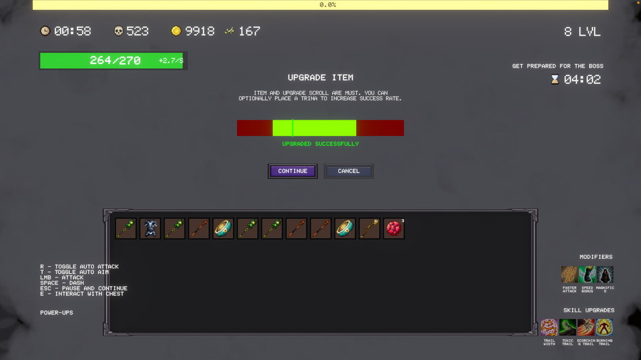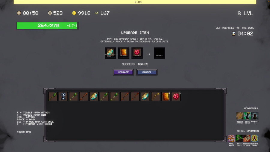 このゲームのポイントは、単なるアップグレードカードの選択に留まらない。装備を強化するためには、鍛冶屋の「Anvil」にたどり着き、アイテムを置いて決断を下す必要がある。安全策をとり小さなバフを得るか、あるいは装備の完全破壊のリスクを負ってでも神のような力を目指すか、という緊張感の高い選択をプレイヤーに迫る。