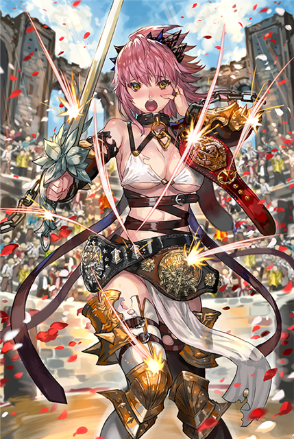 約千年後の未来で、副都にある闘技場の剣闘士をしている女性。見た目からは想像もできないような打たれ強さを誇り、ピンチからの大逆転で勝利する華々しい戦闘スタイルでチャンピオンまで登り詰めた。その実態は、痛みを感じれば感じるほど強くなるという特殊な嗜好の持ち主である。また、彼女は義勇軍のとある人物の子孫だとも言われているが……?