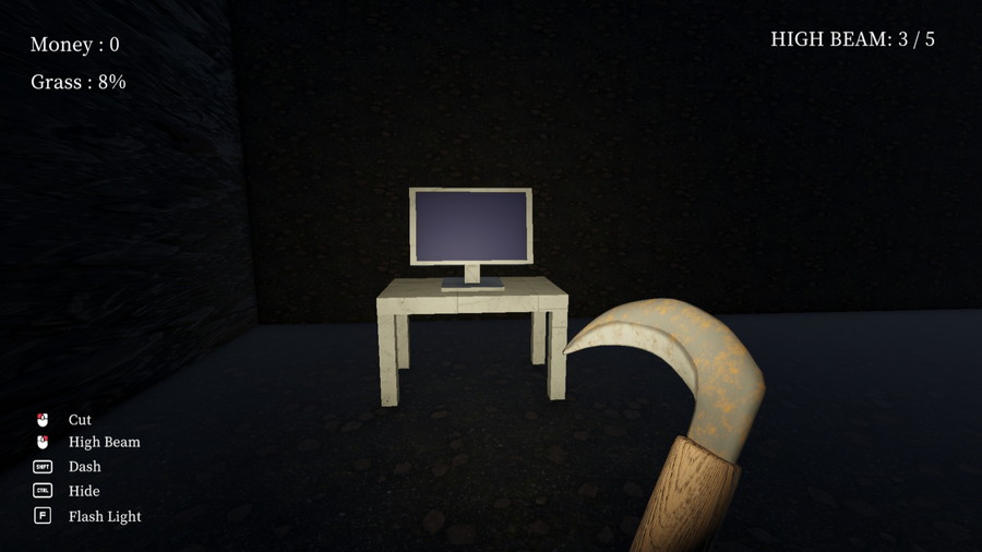 ・暗闇に潜む怪物から隠れて草を刈るステルス&アクション要素。怪物はプレイヤーの足音、鎌を振る音、懐中電灯の光に敏感に反応する。心臓音で怪物の位置を察知し、見つからないように作業を進める。