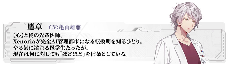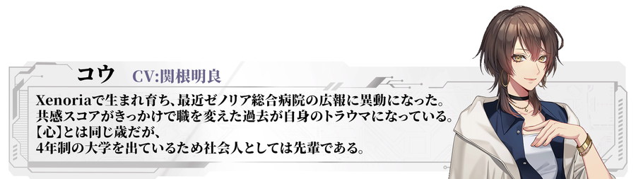 日本語版のみフルボイスとなる本作の攻略対象3名のキャストも発表された。主人公と同じ病院で働く医師・柊役を深町寿成さん、主人公の隣人で懐いているタチバナ役を石谷春貴さん、主人公をいつも助けてくれる謎多きアクト役を土岐隼一さんが演じる。