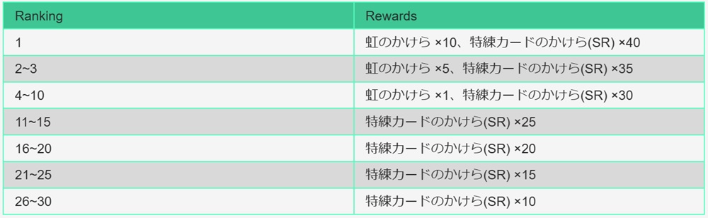 また、試合で獲得したPtのデイリーランキングの順位に応じて、特練カードのかけら(SR)を獲得できる。さらに上位入賞者は「虹のかけら」も獲得できる。