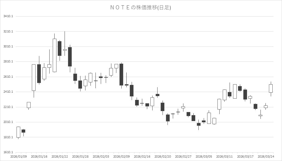 ファイナンス 【株式】noteが大幅続伸 KADOKAWAと資本業務提携発表が刺激材料に 株式 2026.03.25 15:04 3月25日の東京株式市場では、note<5243>が大幅続伸。前日、KADOKAWA<9468>と資本業務提携を行うと発表したことが刺激材料となったようだ。資本提携ではnoteがKADOKAWAに対して、議決権比率5.22%にあたる普通株式100万株を割り当てる一方、クリエイターによるコンテンツ創出の最大化と次世代IP運用エコシステムの確率を目的とした取り組みを行う、としている(詳細)。 株価推移は以下の通り。