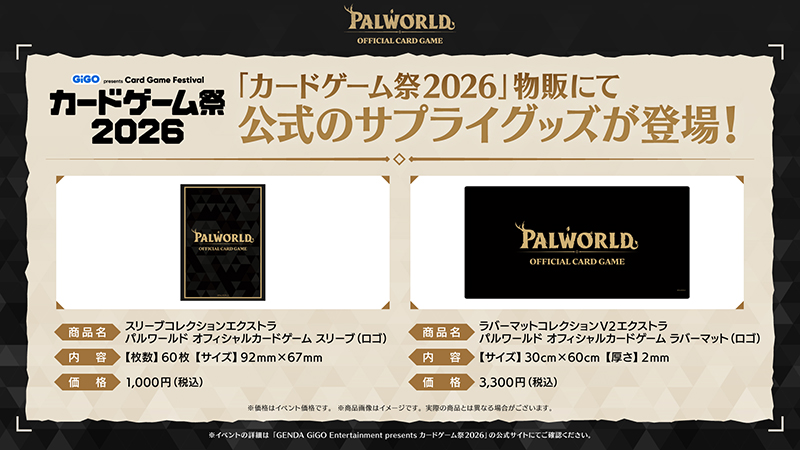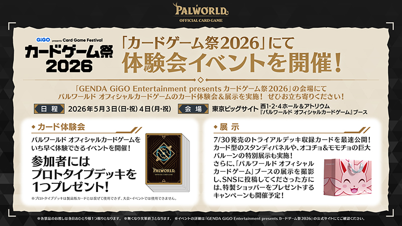『パルワールド オフィシャルカードゲーム』は、2026年5月3日、4日に東京ビッグサイトで開催される「GENDA GiGO Entertainment presents カードゲーム祭2026」会場にてカード体験会と展示を実施する。