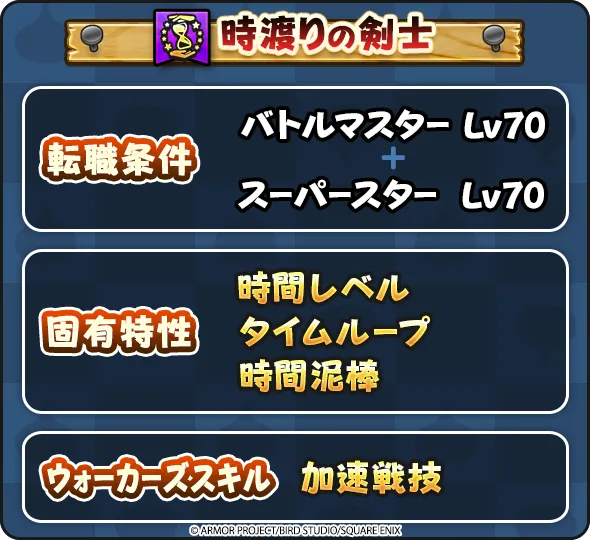 時渡りの剣士には、上級職「バトルマスター」「スーパースター」をLv.70以上にすると転職できるぞ!得意なぶきは「片手剣」「オノ」「短剣」「ヤリ」「ブーメラン」だ!