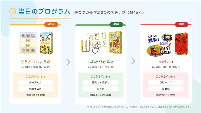 イベントでは、ボードゲーム会社代表がゲームの魅力と遊び方を解説しながら、実際にゲームに収録されている初級編を遊ぶ。保護者も交じって遊ぶことで、ゲームの楽しさを一緒に体験してもらう。