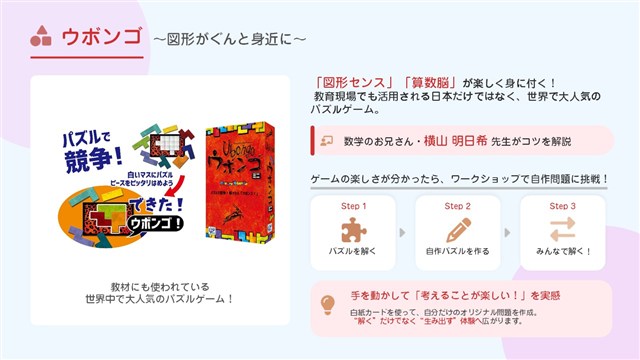 最後はワークショップへ。白紙カードで、自分だけのオリジナル問題を作成する。自分で問題を作り、参加者同士で交換して解くことで、図形を“解く”だけでなく、“考える・生み出す”体験へと広がる。ウボンゴを通じて、図形を自然と理解でき、「手を動かしながら考えることのおもしろさ」を感じられる時間になる。