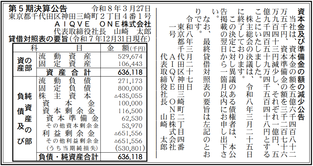 AIQVE ONE(アイキューブワン)が減資を行うことがわかった。3月27日付の「官報」に掲載された「資本金及び準備金の額の減少公告」によると、資本金を5億6400万円、準備金を3200万円減らしてそれぞれ1億円、5億9400万円にするとのこと。3月25日に株主総会の決議が終了したという。