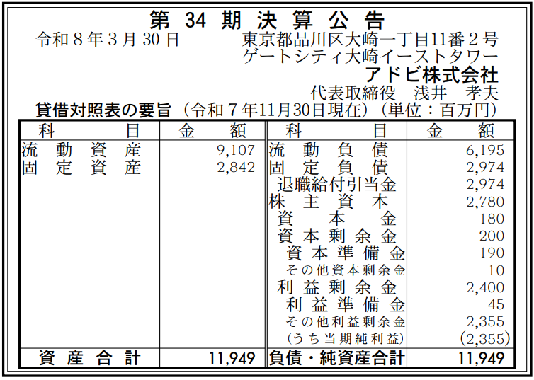 アドビの2025年11月期(第34期)の決算は、最終利益が前の期比1.4%増の23億5500万円と増益を達成した。前の期(2024年11月期)の実績は、最終利益23億2100万円だった。3月30日付の『官報』に掲載された「決算公告」で判明した。