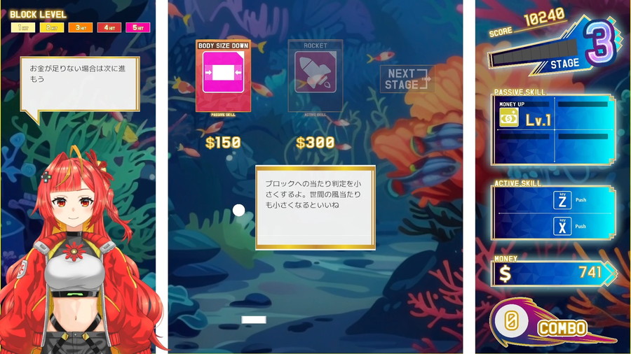 特定のポイントを稼ぐと、ブロックを崩した時に得られるお金でスキルを購入でき、プレイを有利に進められる。スキルの中には「一定時間ボールが貫通するもの」や「一定時間時間が停止するもの」などがあり、好きなスキルを見つけて自分だけの無限∞ブロック崩しを楽しめる。