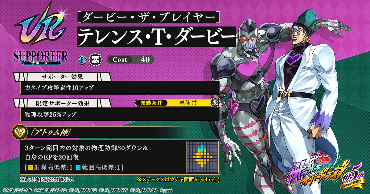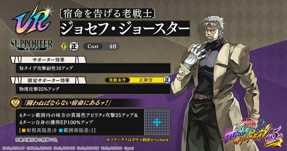 gumi<3903>は、「ジョジョの奇妙な冒険」のアニメーションIPを活用した新作アプリゲーム『ジョジョの奇妙な冒険 オラオラオーバードライブ』において、4月1日(水)0時頃より、オラドラフェス限定!新ユニット、新アシストカードが登場する。