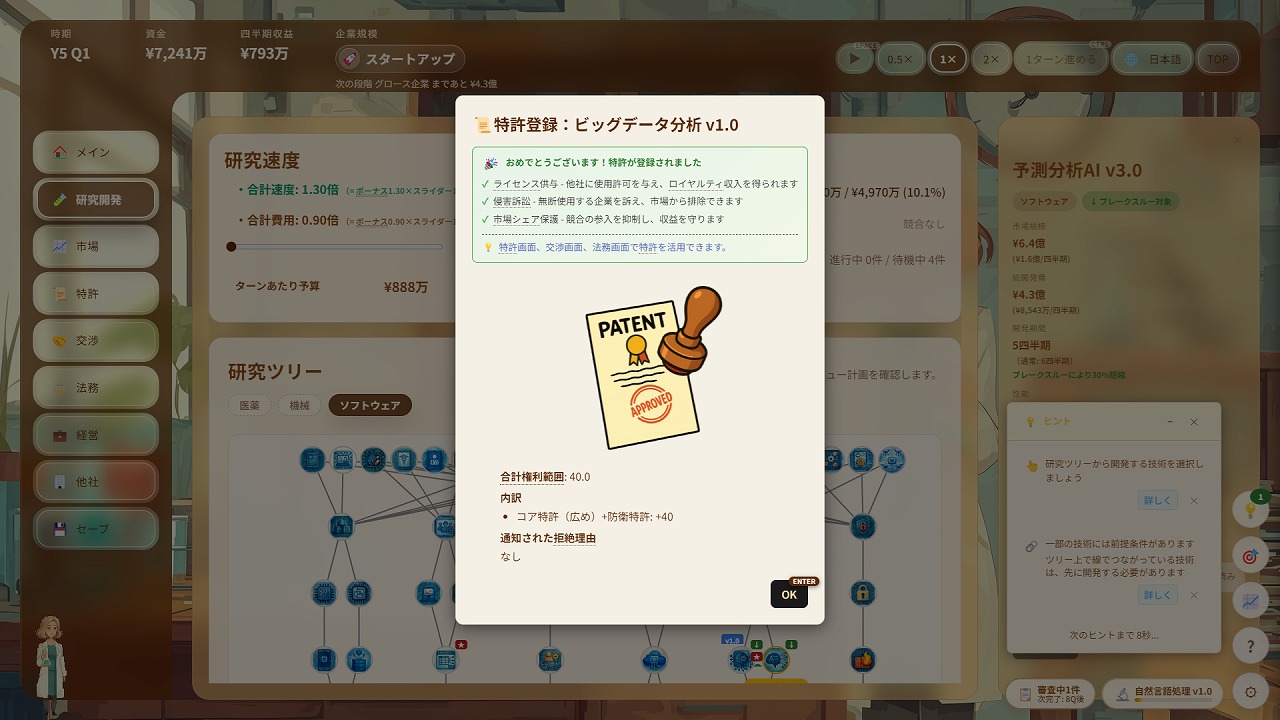 『Patent Tycoon』は、特許の取得・ライセンス・訴訟・買収を通じて企業を成長させる、特許経営シミュレーションゲーム。