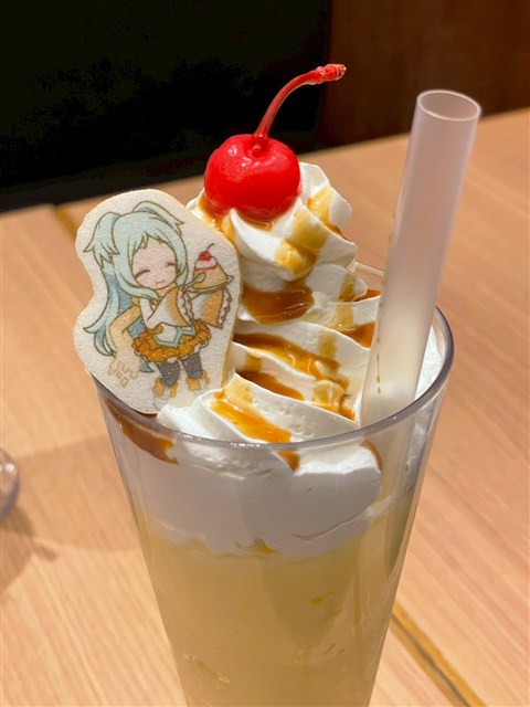 一方、【悪魔偽王国軍(ディアボロス)】ミヤコのおすすめ飲めるプリンなの~♪は、“プリンドリンク”が気になってのチョイスだったのだが、これが想像以上に物凄く“プリン”。ミヤコのイメージをそのままメニュー化したようなドリンクとなっている。キャラメルソースやホイップクリームと共に飲むと、甘味や苦味も加わり、一層美味しく感じられる。