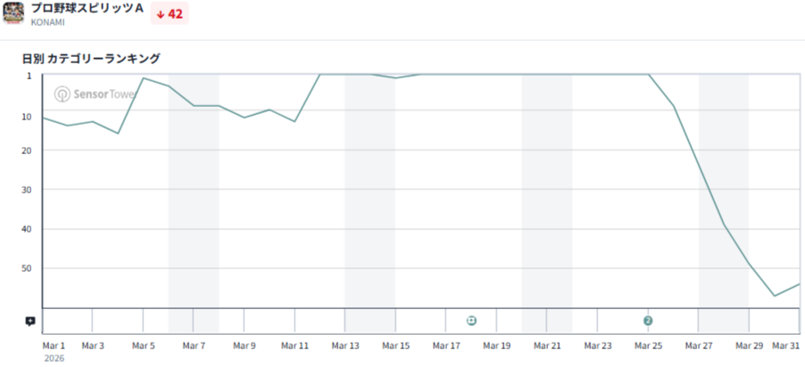 2位は、コナミデジタルエンタテインメント『プロ野球スピリッツA』が僅差で続いた。WBCのグローバルスポンサーに就任しており、「侍ジャパン」のゲーム内での実装など効果的な施策が収益につながったようだ。プロ野球の2026シーズンの開幕にあわせたアップデートも奏功したもようだ。