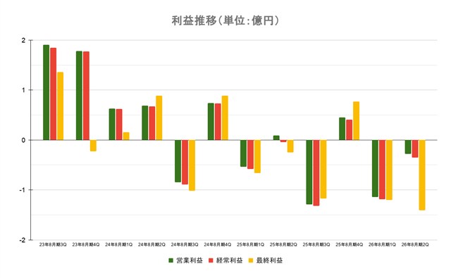 - 売上高23億1600万円、営業損益1億2900万円の赤字、経常損益1億5300万円の赤字、最終損益1億3100万円の赤字(2025年8月期)
