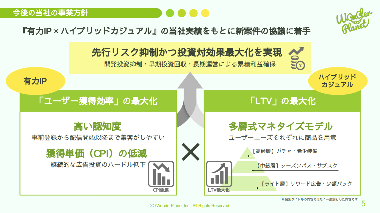 同社にとって大きかったのは、ビジネス的な成功というだけでなく、有力IPxハイブリッドカジュアルという新たなロールモデルができ上がったことだ。IPを使った効率的な集客、ガチャからシーズンパス、広告を使った多層的なマネタイズモデルでリスクを抑制し早期の回収を可能にしている。