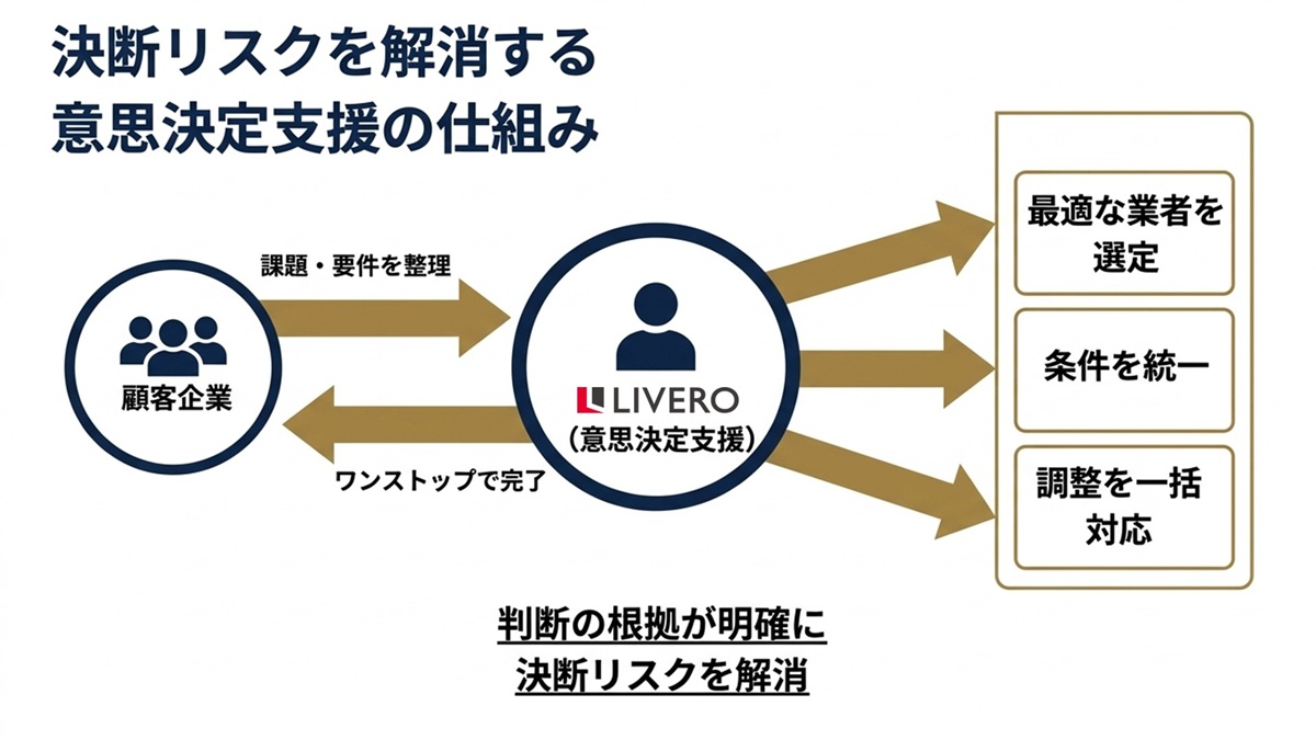 この構造的な課題を解消するのが、本サービス。本サービスは、単なる業者紹介や事務代行ではなく、「意思決定の正当性を担保する」ことを目的としたコンシェルジュサービスである。