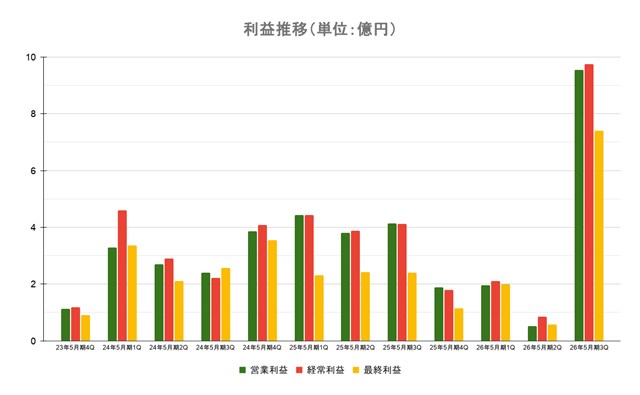 - 売上高145億9800万円、営業利益14億2600万円、経常利益14億2000万円、最終利益8億2800万円(2025年5月期)